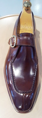 Even though I was not in the market to buy anything (as I need another shoe like I need a hole in the head), I couldn't help but try them on just to see how they measured up to other brands. They had two lasts on hand, one being the Simpson (my favorite - shown here) and the other being the Robert (I believe?? - not found on the website), which was a bit more conservatively elegant and rounded. Both of them fit me surprisingly well. I say that because I have quite a narrow foot and many shoes seem to be a bit spacious on me, yet these were not in least. They were a very sturdy shoe, on the verge of being stiff, but also signifying, for me, a well-made shoe that could last a lifetime! Not only were they well made, but very comfortable in the fitting as well i.e. in the way that they hugged my arch. I felt supported properly, something that is quite important when buying leather soled dress shoes that you might spend a whole day in.
